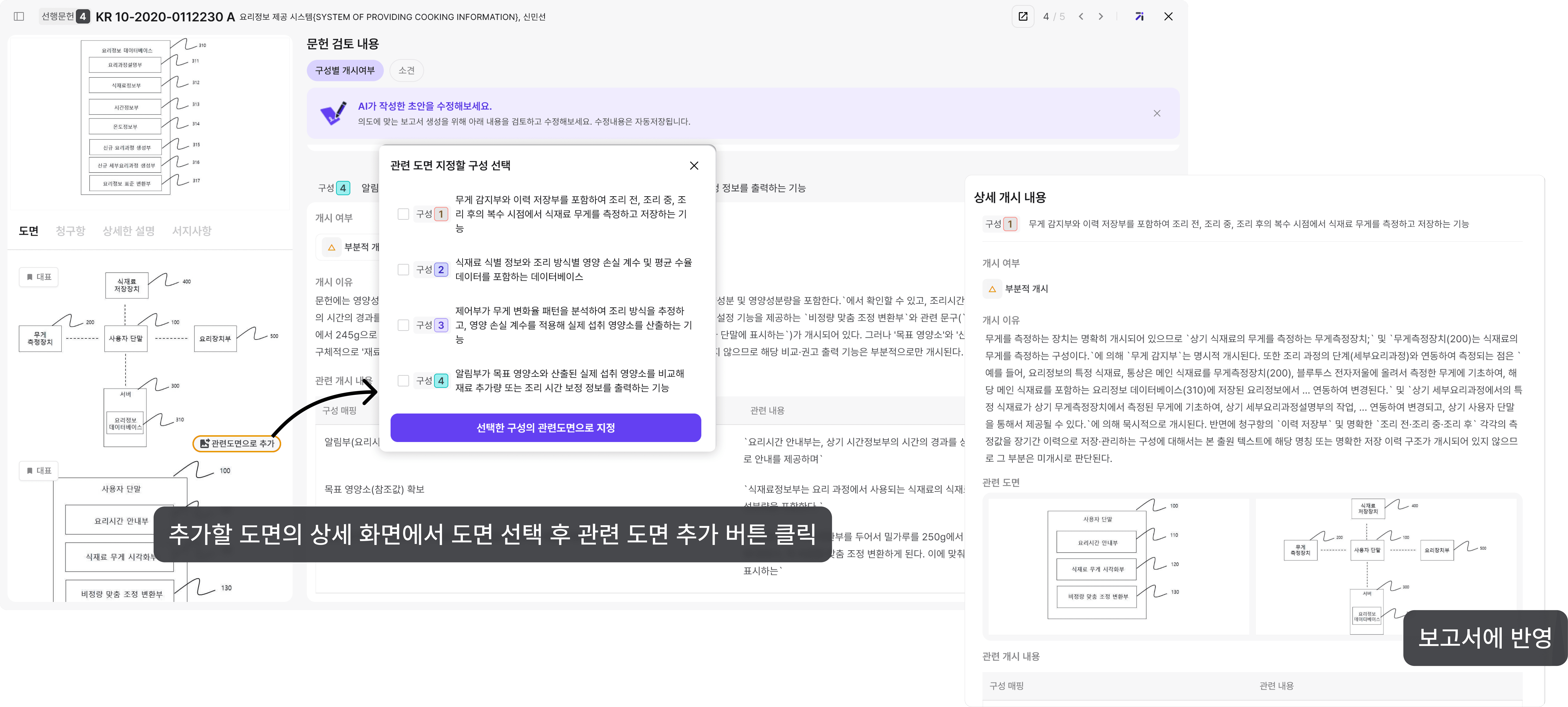 문헌 상세 → [관련 도면으로 추가] → 추가할 위치(구성) 선택 → 보고서 반영