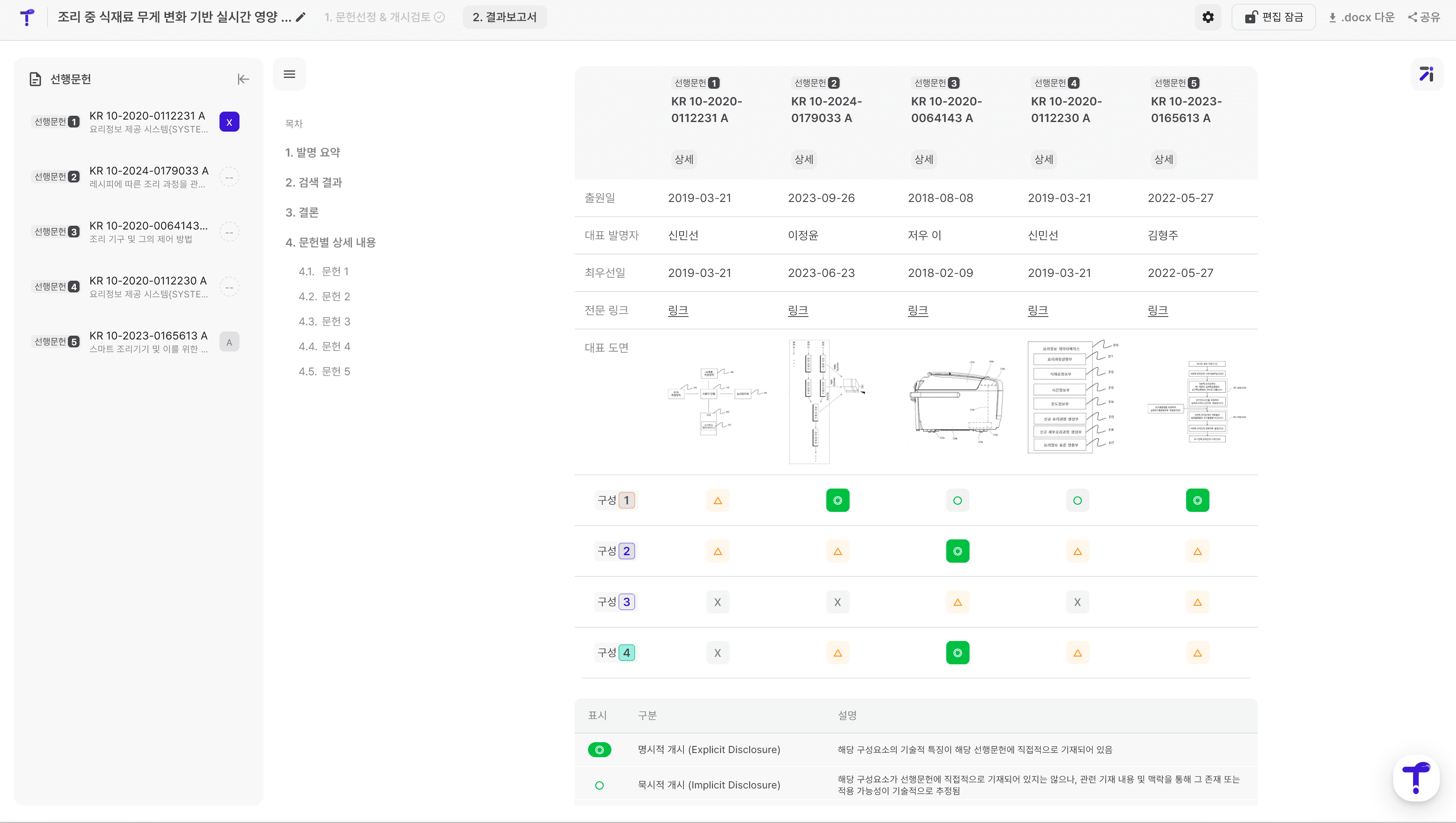 A. 각 구성 요소가 해당 문헌에 명시적으로 있는지(O), 묵시적으로 유추 가능한지(△), 없는지(X)를 AI가 판단합니다. 상세 보기 기능을 통해 AI가 왜 그렇게 판단했는지 구체적인 이유를 확인할 수 있습니다.