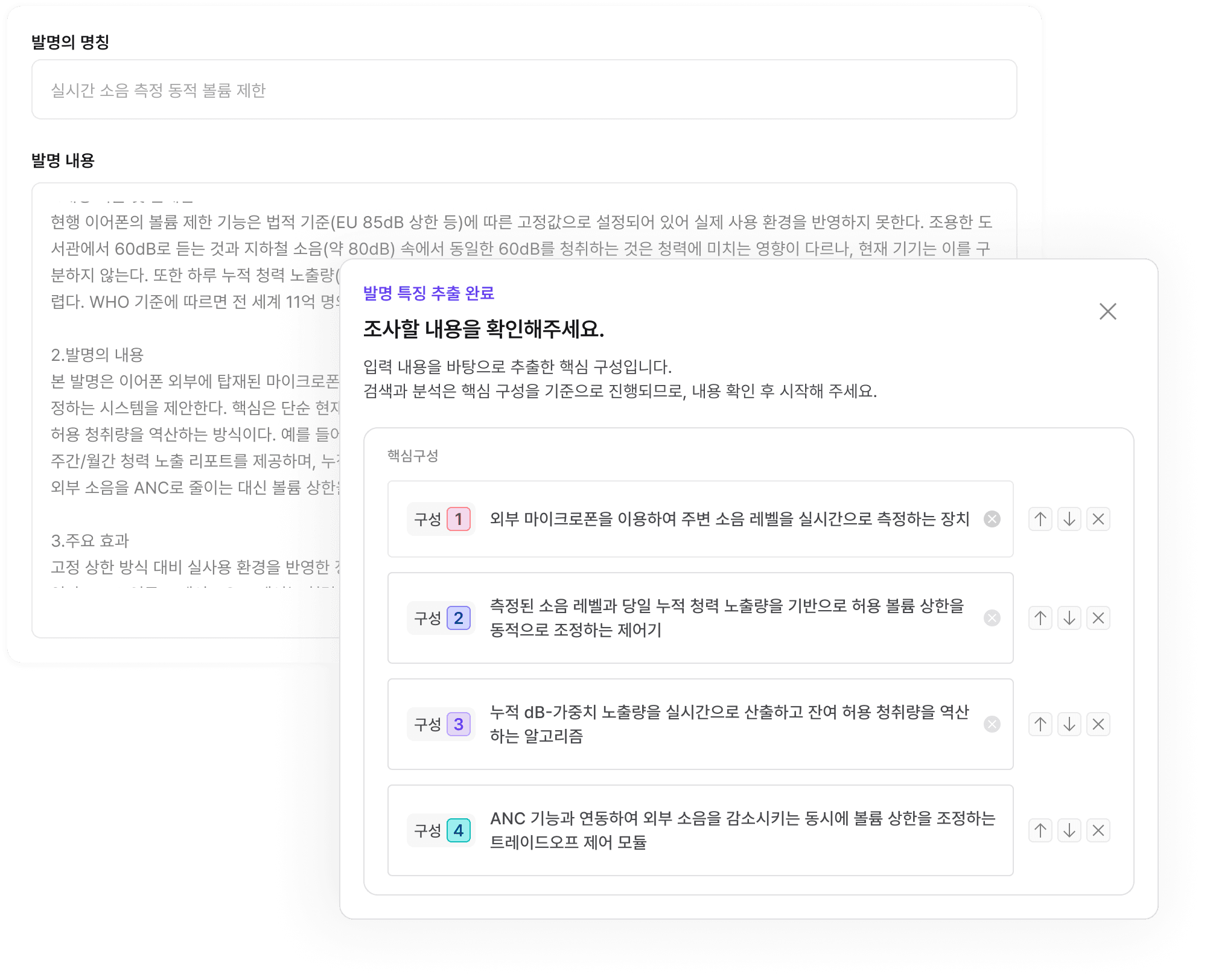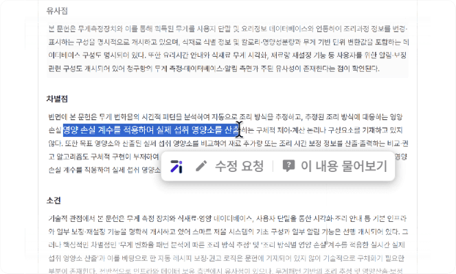 발명 내용만 입력하면 AI가 핵심 특징을 분절을 제안합니다. 특허를 이해하는 자체 AI가 검색해 검색식을 짤 필요 없이 누락 걱정도 없습니다.