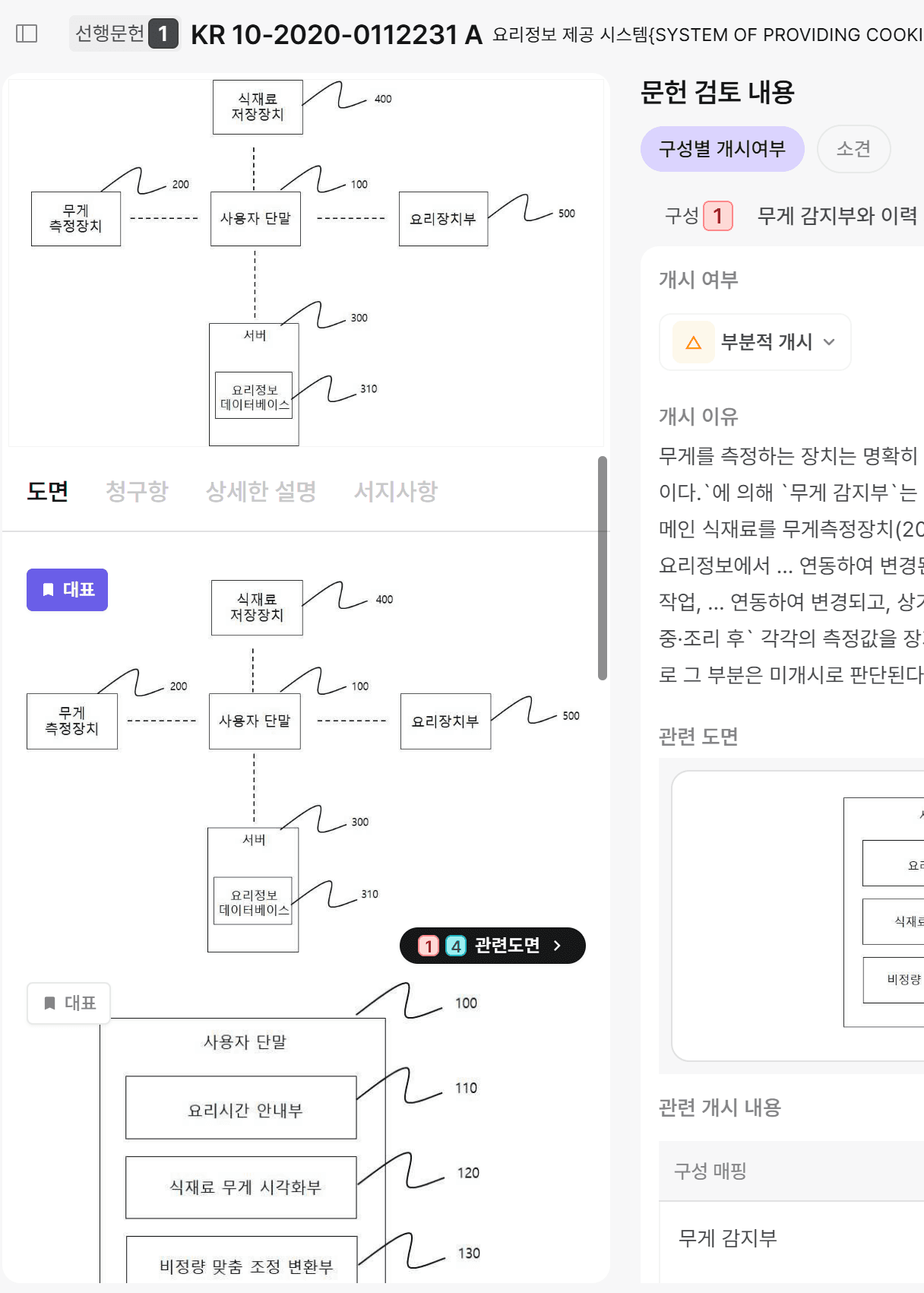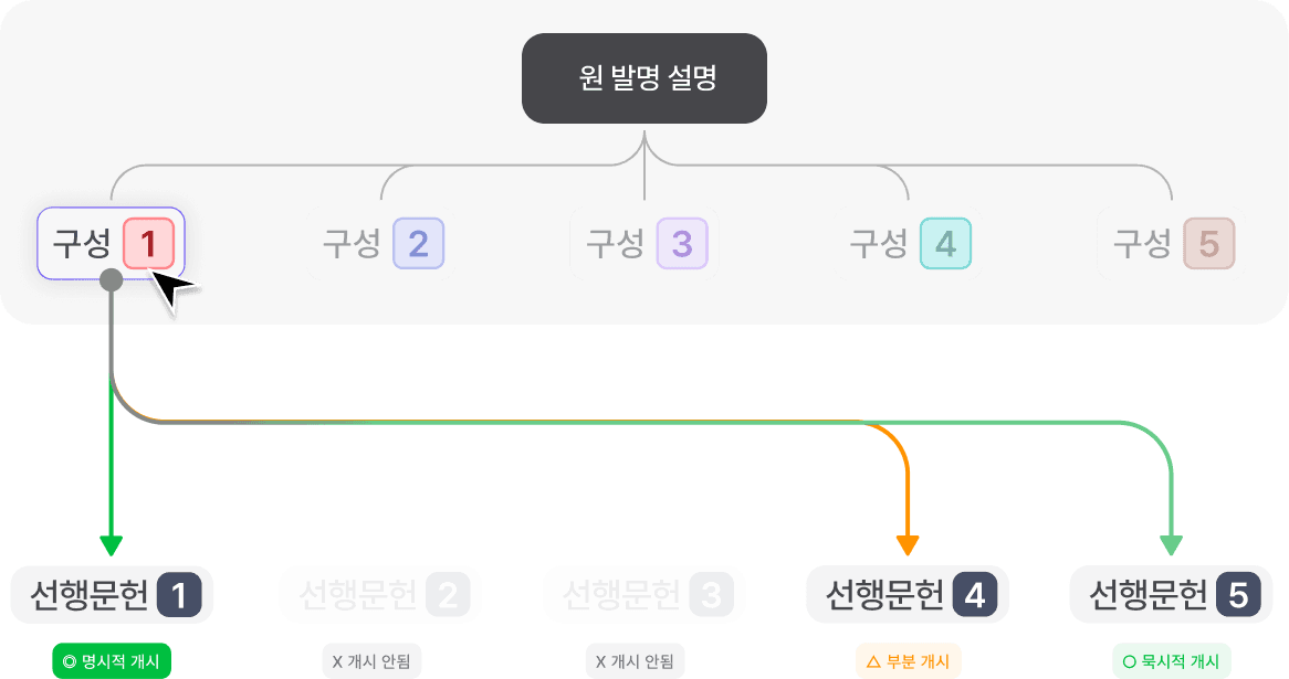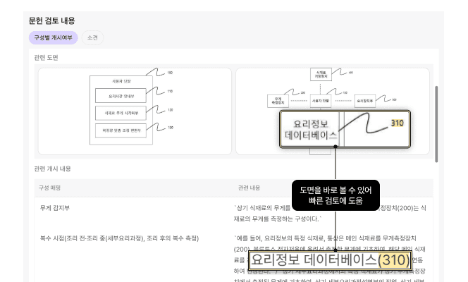 발명 구성별로 어떤 문헌의 어떤 내용이 매칭됐는지 구조적으로 보여줍니다.